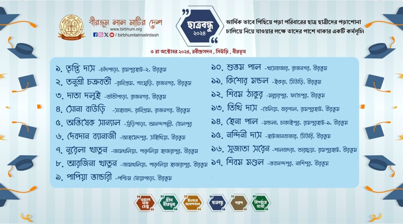 ছাত্রবন্ধু ২০২৪ -মেধাবী ও আর্থিক ভাবে পিছিয়ে পড়া পরিবারের ছাত্র ছাত্রীদের পাশে থাকার বীরভূম লাল মাটির দেশের একটি কর্মসূচী। এবছর ১৭ জন ছাত্র ছাত্রীর পাশে থাকলাম আমরা ।