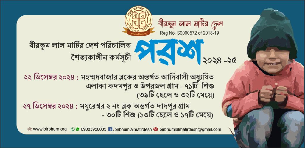 পরশ ২০২৪ এর প্রস্তুতি Admin 26, December 2024 পরশ Comments Off on পরশ ২০২৪ এর প্রস্তুতি 263 Views ২২ ডিসেম্বর ২০২৪ : মহম্মদবাজার ব্লকের অন্তর্গত আদিবাসী অধ্যুষিত এলাকা কদমপুর ও উপরজল গ্রাম – ৭১টি এ শিশু(৩৯টি ছেলে ও ৩২টি মেয়ে) ২৭ ডিসেম্বর ২০২৪ : মযুরেশ্বর ২ নং ব্লক অন্তর্গত দাদপুর গ্রাম- ৩০টি এ শিশু(১৩টি ছেলে ও ১৭টি মেয়ে) Comments
